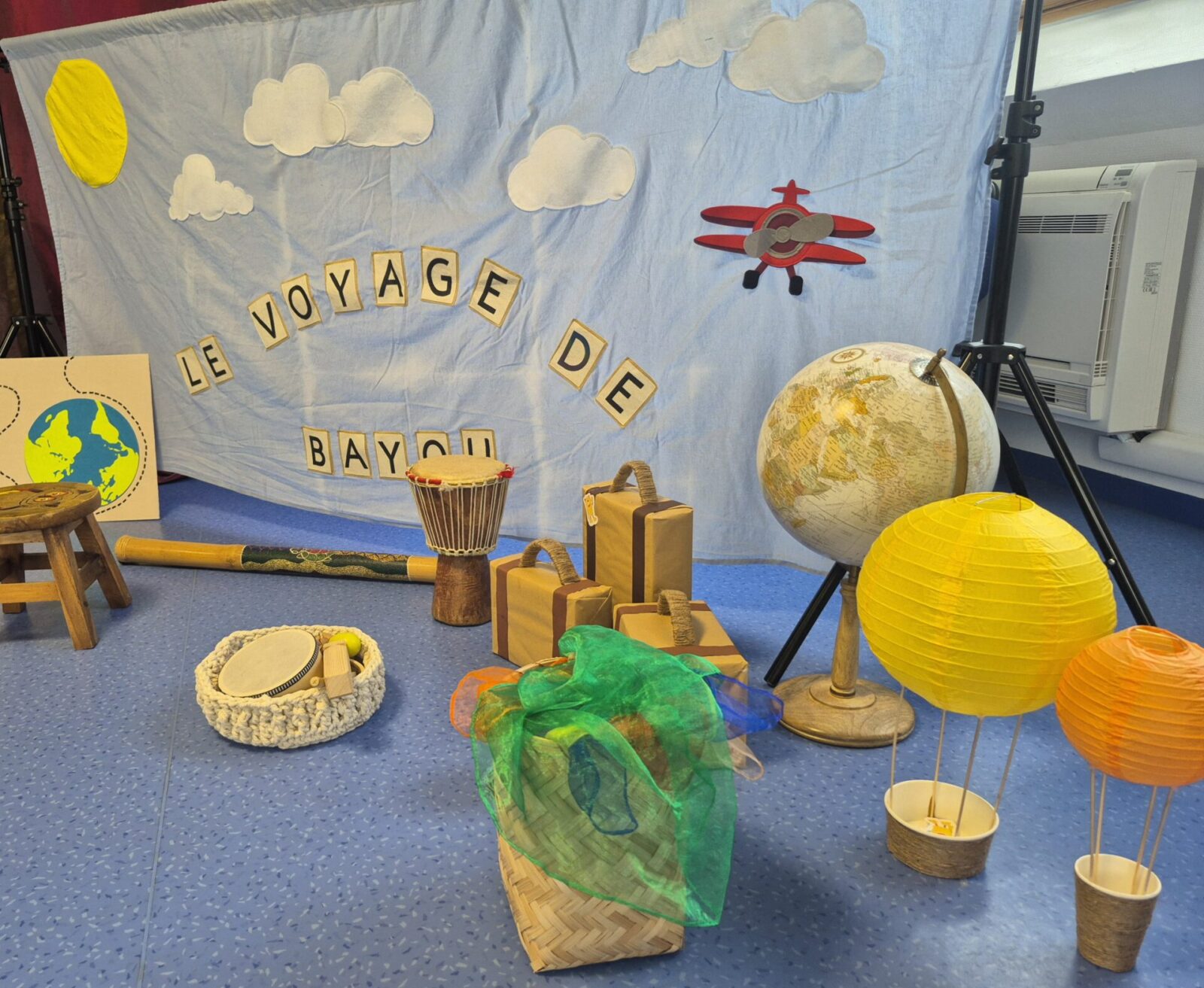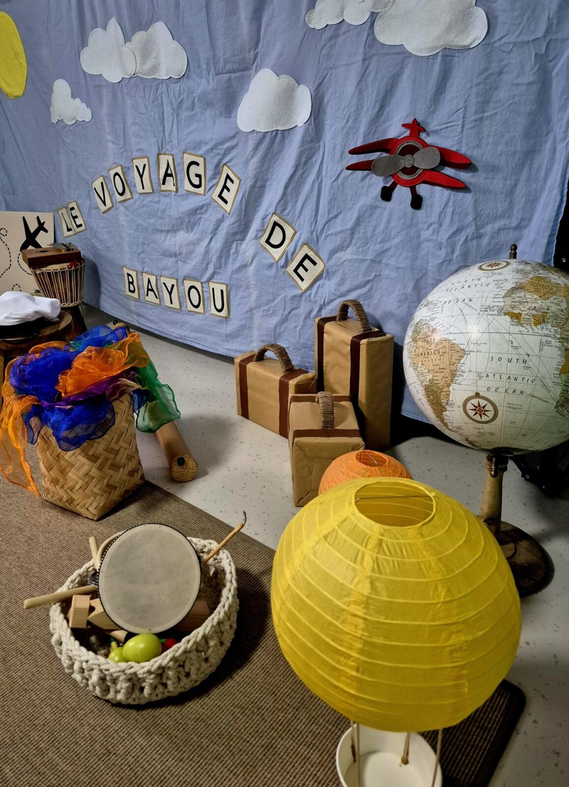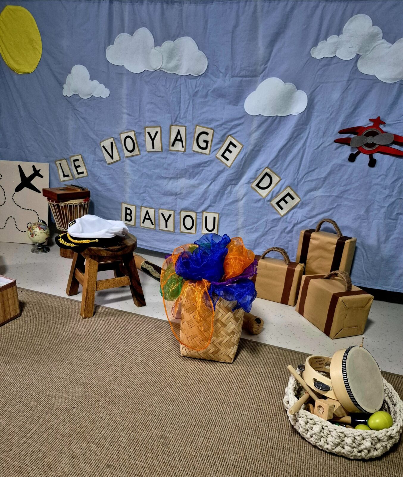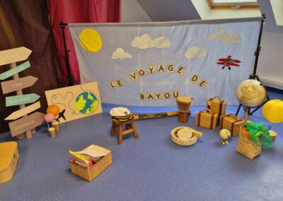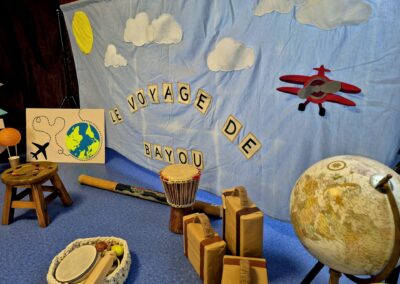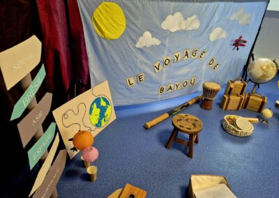 À l’aide de petits instruments (maracas, percussions), de foulards colorés et de mouvements dansés, les enfants sont invités à écouter, manipuler, chanter et bouger tout au long du voyage.