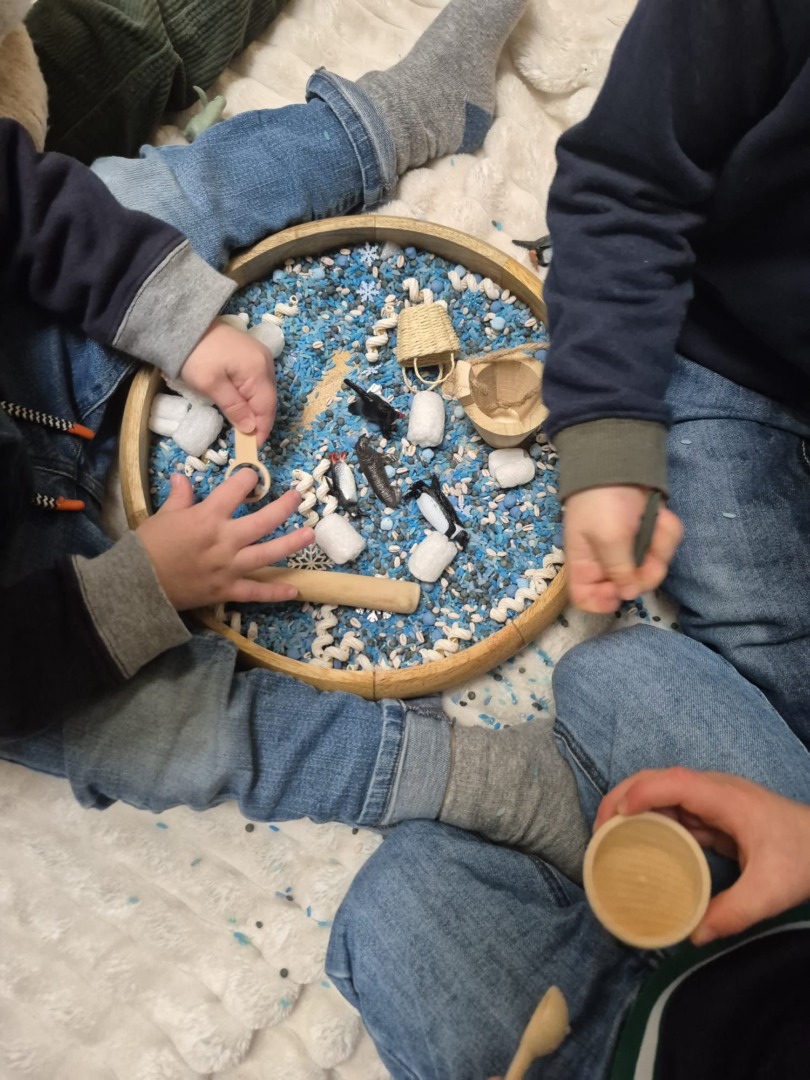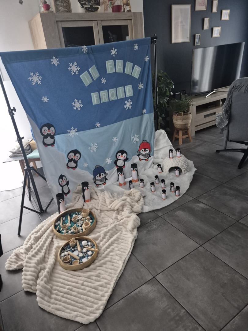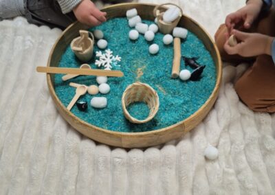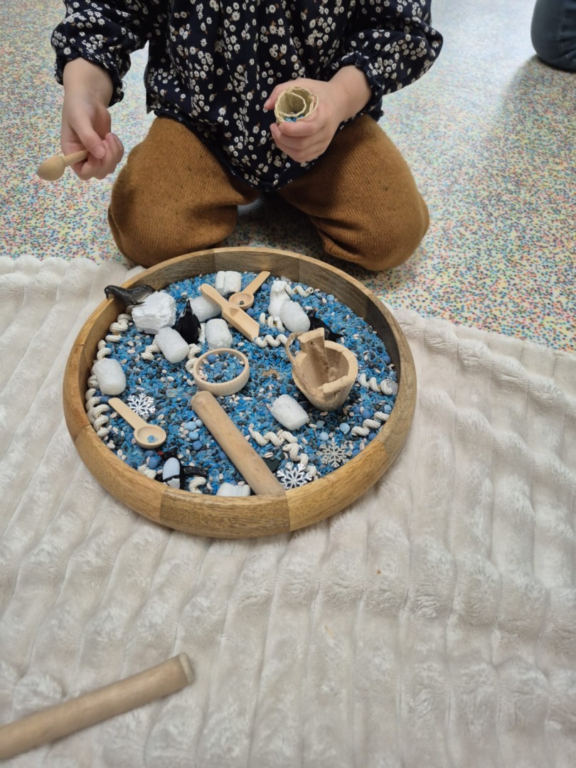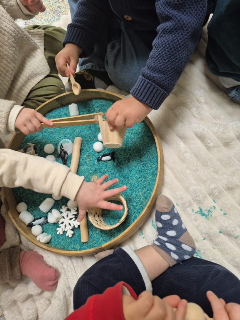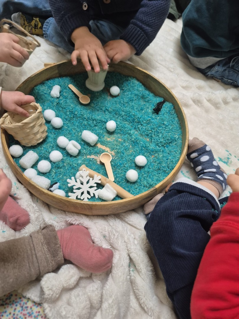Entre bouteilles sensorielles, bacs de transvasement de riz coloré, matériel en bois et décor immersif autour de la banquise fait main, les enfants manipulent, observent et expérimentent librement.