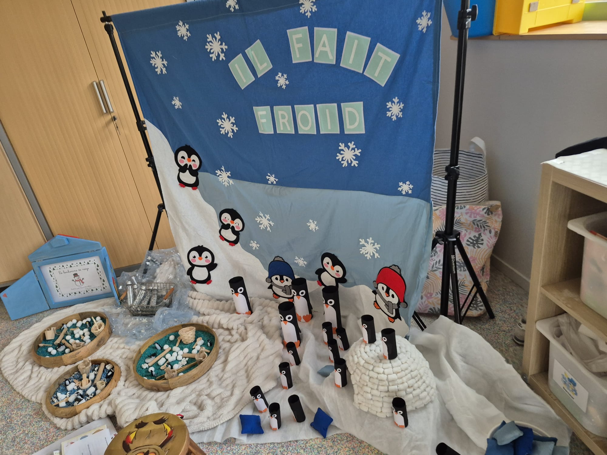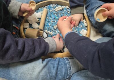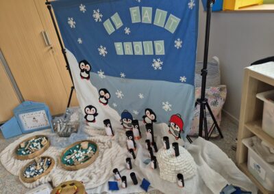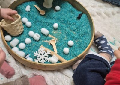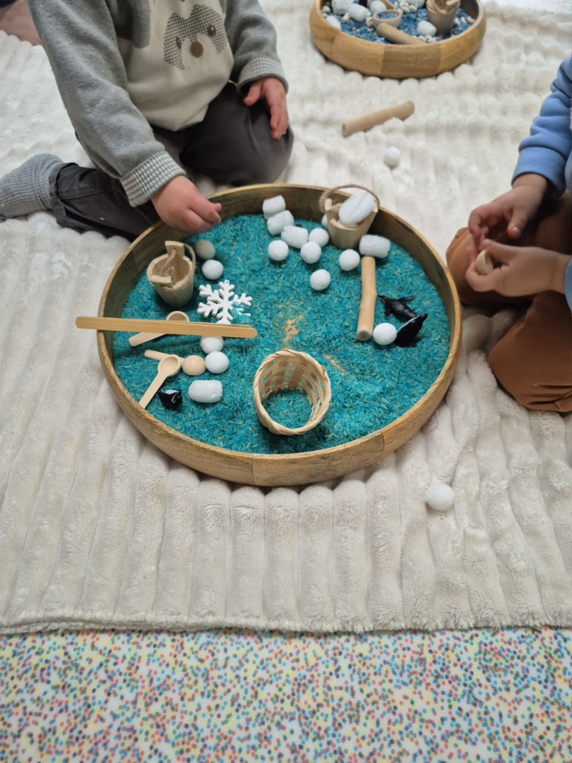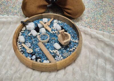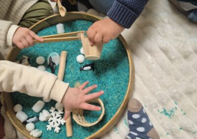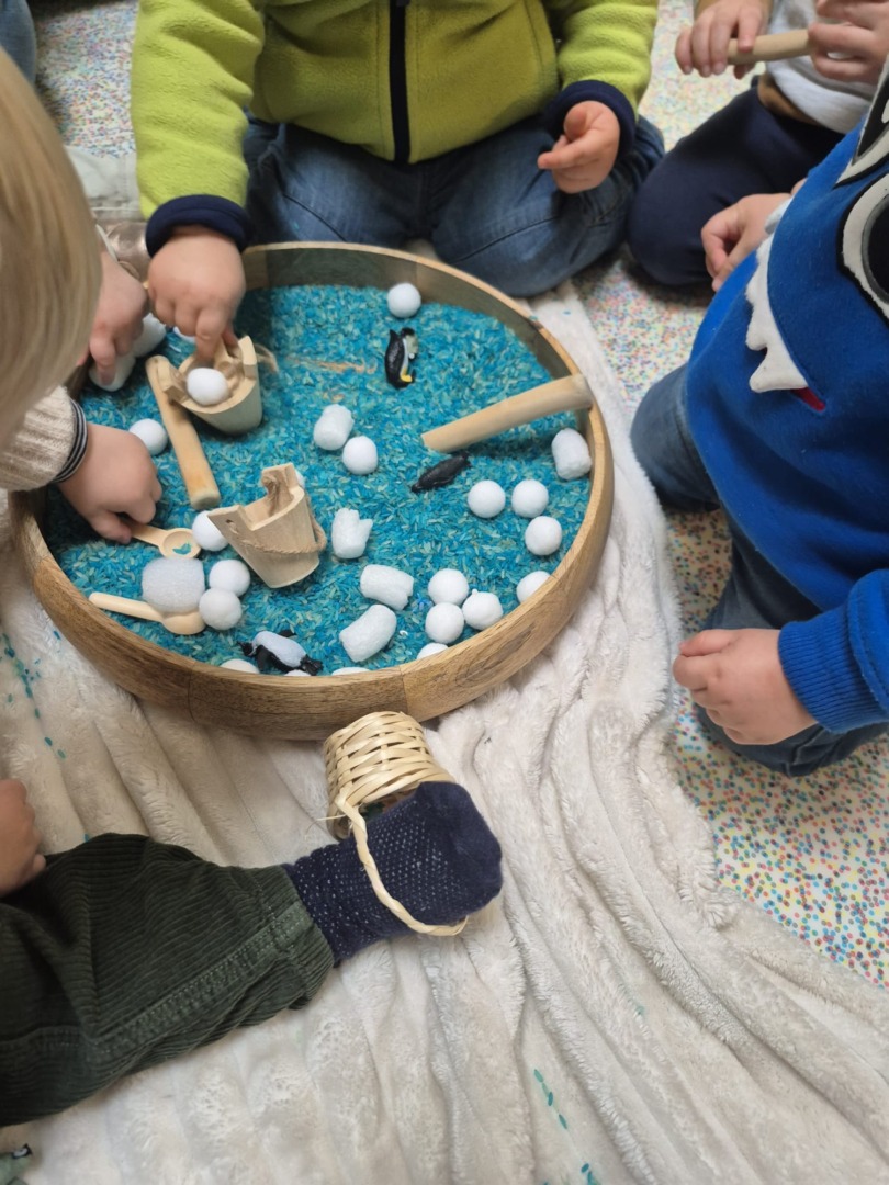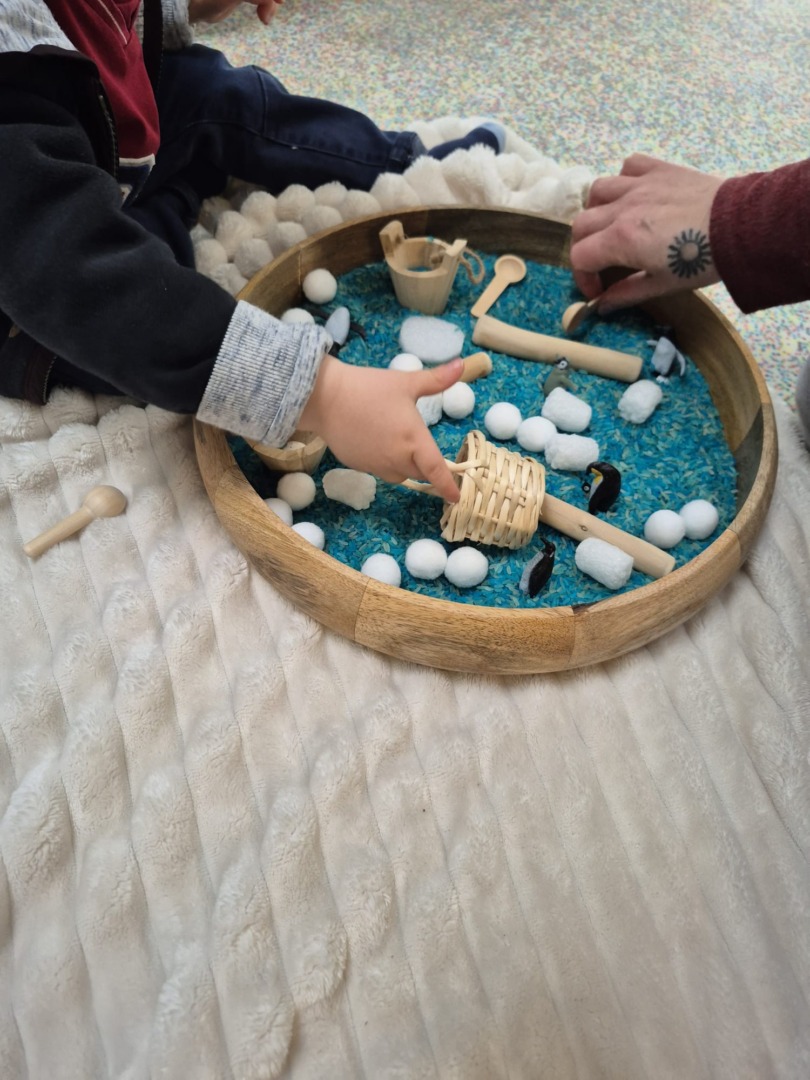Entre bouteilles sensorielles, bacs de transvasement de riz coloré, matériel en bois et décor immersif autour de la banquise fait main, les enfants manipulent, observent et expérimentent librement.