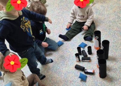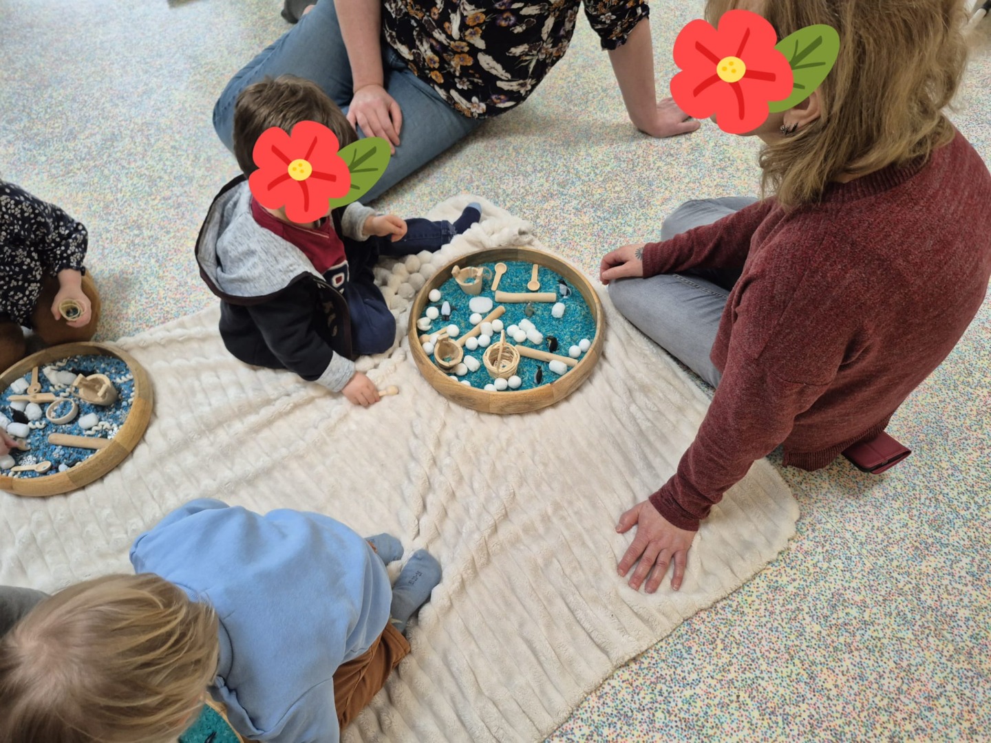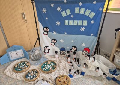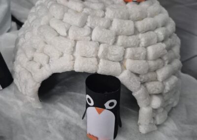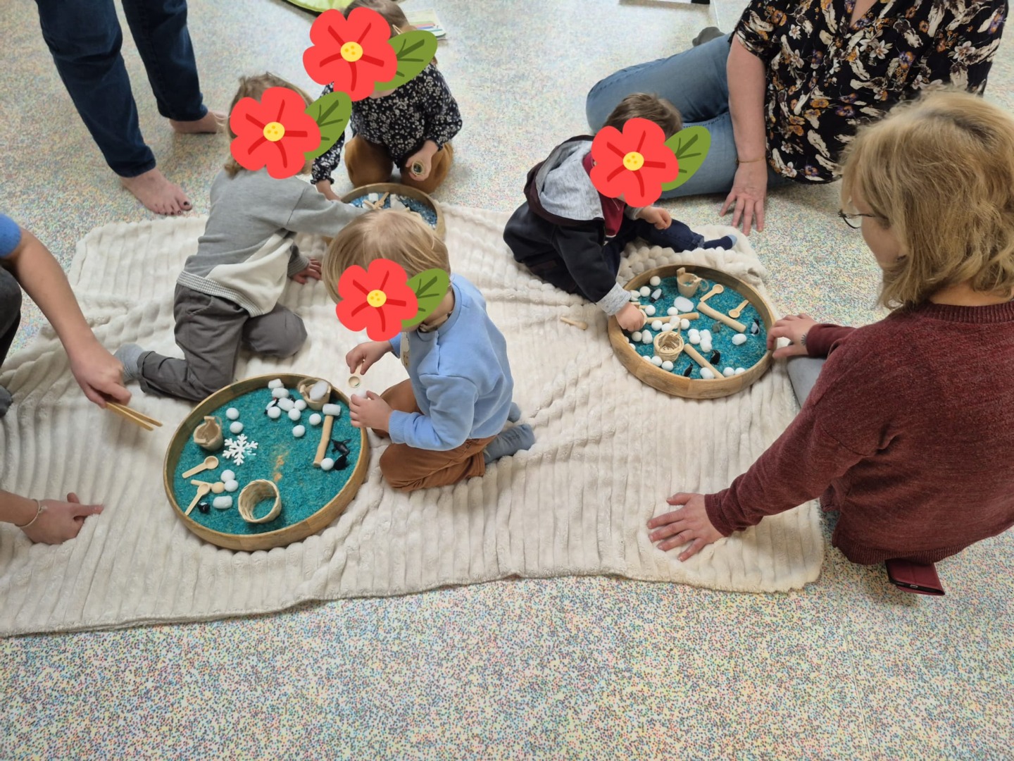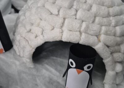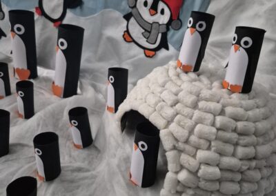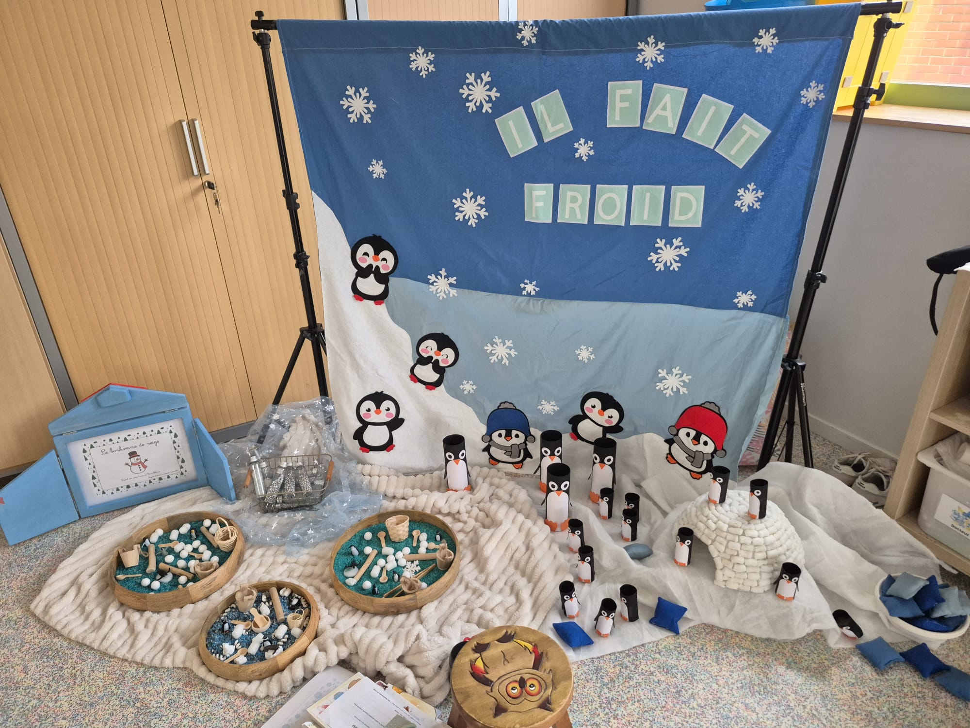 Entre bouteilles sensorielles, bacs de transvasement de riz coloré, matériel en bois et décor immersif autour de la banquise fait main, les enfants manipulent, observent et expérimentent librement.