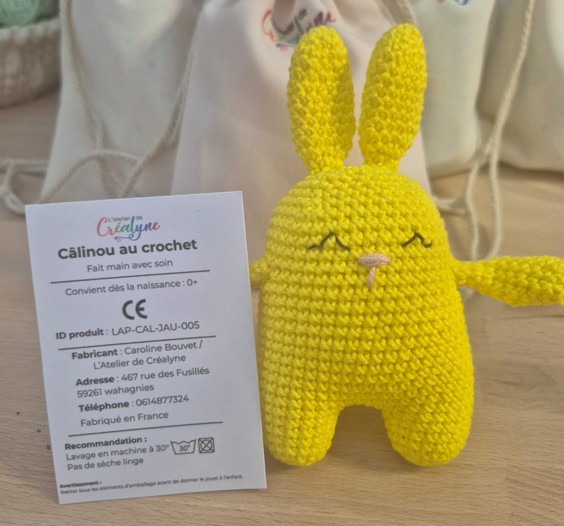 Le lapin au crochet de la collection Les Câlinous est un doudou tout doux, idéal pour accompagner les enfants dès la naissance. Fabriqué à la main en coton 100 % certifié OEKO-TEX, il est à la fois agréable, résistant et sûr pour les plus petits.