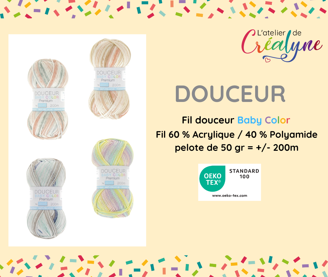 Facile à travailler, la douceur Baby Color glisse agréablement sur le crochet et assure un rendu régulier. Son entretien simple en fait un allié pratique pour un usage quotidien.